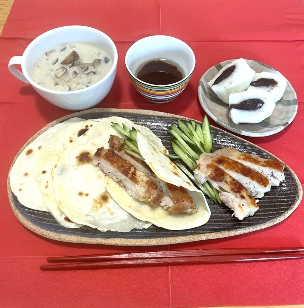 家庭で作れる薬膳料理教室の第2弾です。今回のメニューは、体を温め免疫力をアップさせてくれる鶏肉の北京ダック風、気を補い胃腸を整えるキノコとジャガイモの豆乳スープ、肺を潤し気と血を補うかるかんロールとなつめのお茶の3品となります。