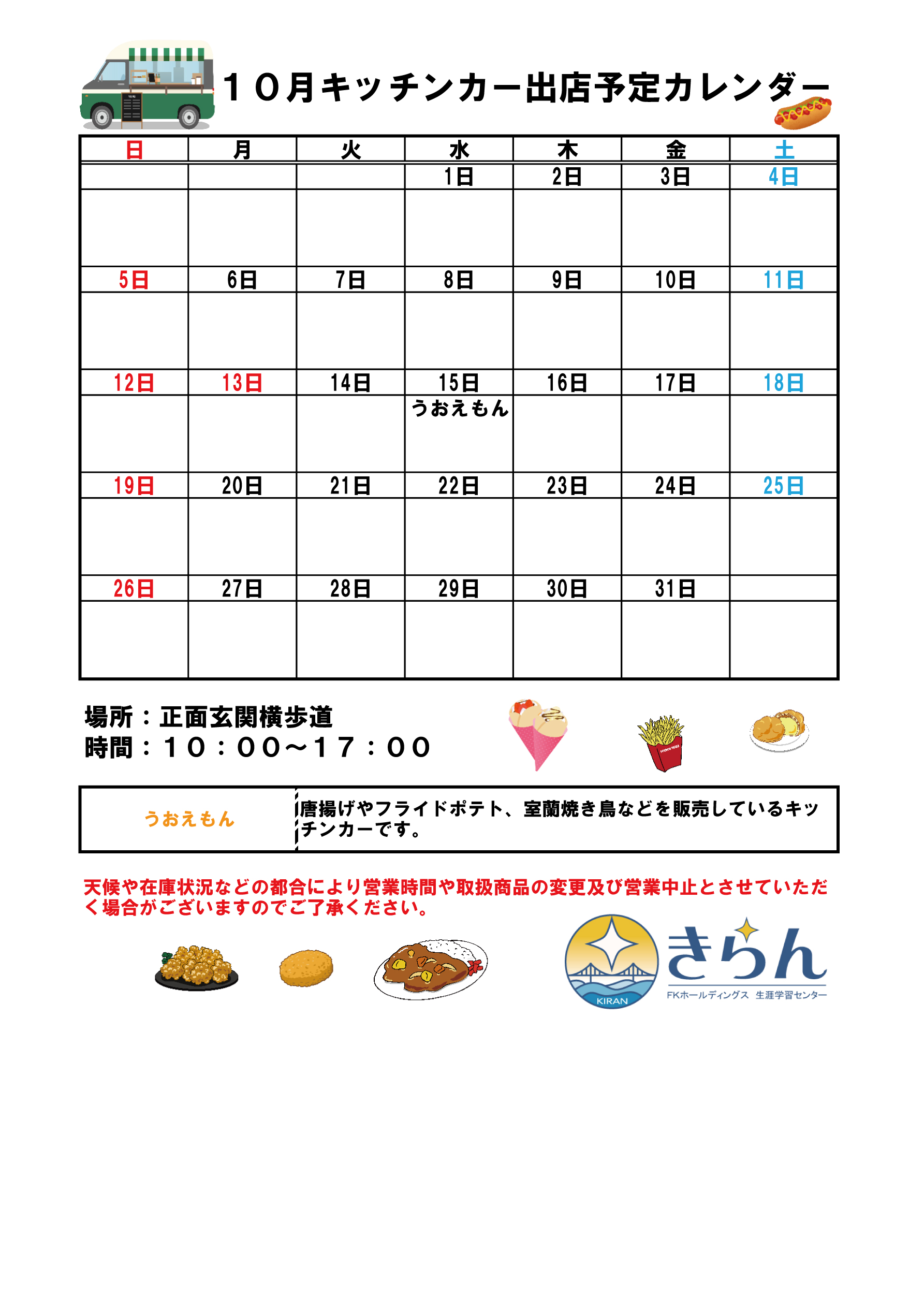 キッチンカー出店予定カレンダー